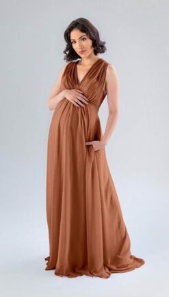 Misty is a fun maternity chic bridesmaid gown that is perfect for your unique bridal party. Flowy and comfortable, this dress is perfect for expecting mothers. Features of Misty Include: Chiffon fabric V-neckline Pleated bodice Keyhole back A-line flowy skirt with pockets Fabric loop and hook to hide and secure zipper Dress accommodates for a height of up to 5’11” Fit and Sizing When taking measurements for this dress, we recommend paying attention to bust and under bust measurements. If you are going to be over 6 months expecting we recommend sizing up 1 size from your current measurements to ensure the dress fits your growing bump. Fabric and Care Misty is made from a chiffon fabric which is comfortable to wear and similar in quality to silk, but much easier to clean and care for. This dress is dry clean optional, but can also be washed regularly at home on a delicate cycle. Best of all, the exceptional quality of the chiffon means Misty will hold up over multiple washes so you can make the most of your dress.